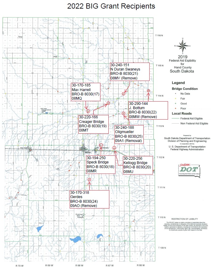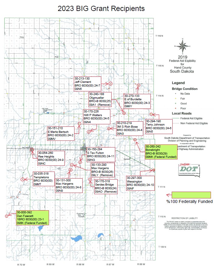 The average cost of one bridge is $750,000. The grant will pay 80% ($600,000) of that expense leaving Hand County with the remaining 20% ($150,000). In comparison, we annually receive an estimated $175,000 from the Wheel Tax. We were required to implement the Wheel Tax to apply for these grants. Mathematically speaking the Wheel tax will cover 1.17 bridges/year.